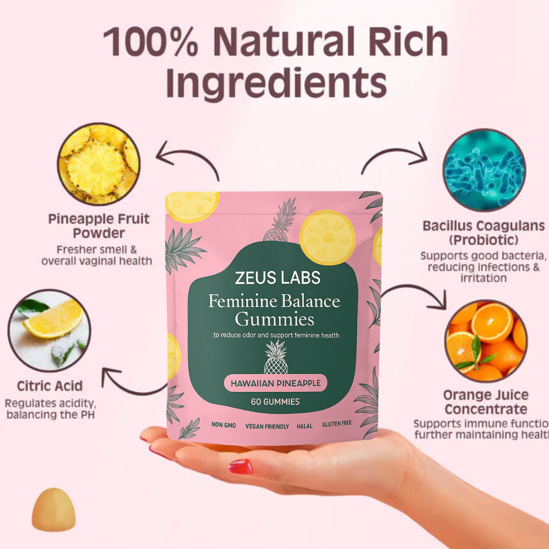 Expertly crafted to support vaginal health and maintain optimal pH levels, these delightful supplements leave you feeling irresistibly fresh with a subtle, sweet pineapple essence and prevent BV and pH Imbalances.