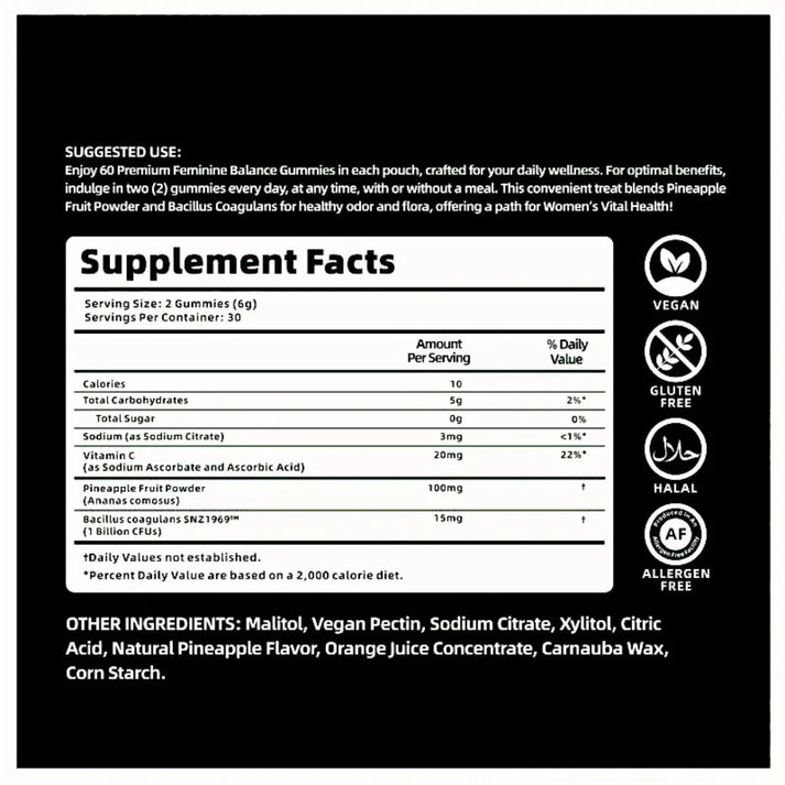 Expertly crafted to support vaginal health and maintain optimal pH levels, these delightful gummies leave you feeling irresistibly fresh with a subtle, sweet pineapple essence.